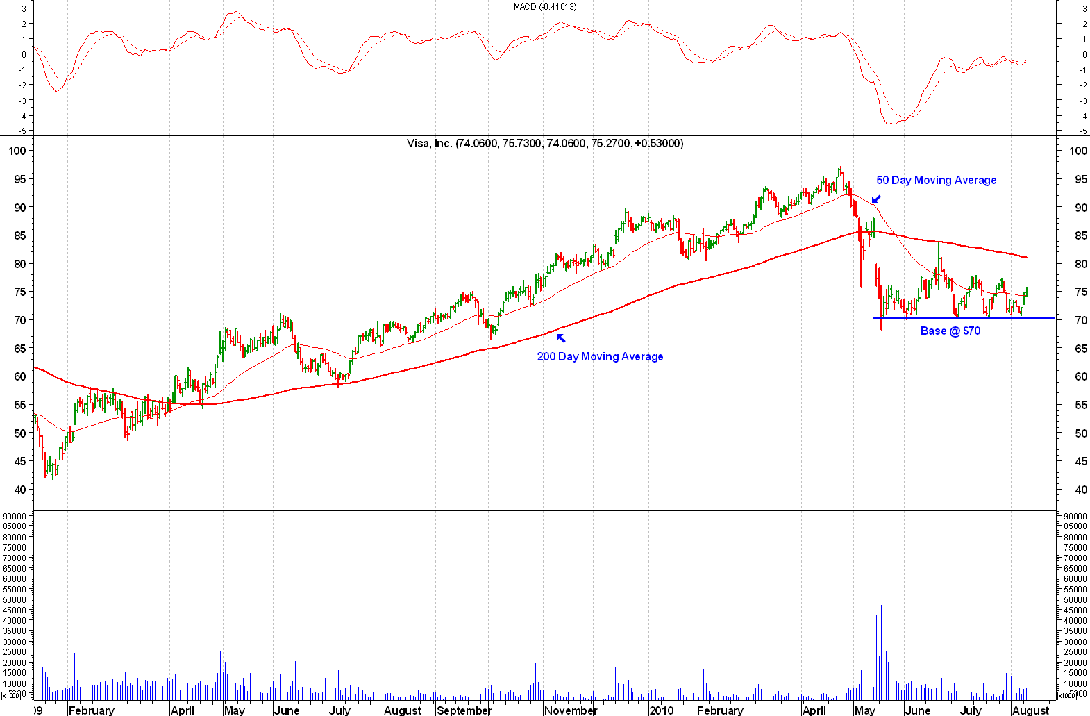 Visa's Gross Margin, Pre-Tax Margin and Net Profit Margin are 82.8%, 55.0% and 34.6%, compared with respective figures of 49.8%, 7.0% and 17.7% for the Business Services Industry. Meanwhile, sales for the most recent quarter soared 23.3% over last year, compared with a 14.2% increase for its typical peer. But its current price-to-earnings multiple of 24.7 trades at a discount to the 27.3 figure touted by its average competitor. And as if that isn't enough, Visa sports Price/Book and Price/Sales multiples of 2.5 and 8.0, versus 6.3 and 8.9 for its common rival. Over the past five quarters, Visa's reported earnings have also beaten the consensus estimate every time, by an average of 5.5%, indicating to us that they will very likely continue to exceed the expectations of Wall Street's Prognostigators. Visa is slated to earn $3.90 during the current fiscal year, or nearly 34% more than last year's take. And in fiscal 2011, analysts are projecting another 21% EPS surge, to $4.73 per share. With the shares currently sitting at $75.27, that would put the p/e multiple based on the estimated 2010 and 2011 bottom lines at 19.3 and 15.9, which is a decent discount to the expected earnings growth mentioned above. Taking everything mentioned above into account, along with a technical picture indicating that the shares are basing in the low $70's, we firmly believe that Visa's recent pullback is a temporary pause in the upward trek, rather than the onset of a more pronounced decline. However, for this neutral trend to become positive once again, the shares must surmount the 200-day moving average, which currently resides near $80 and the 50-day moving average also needs to turn higher. In anticipation of an upside reversal, consider charging up your